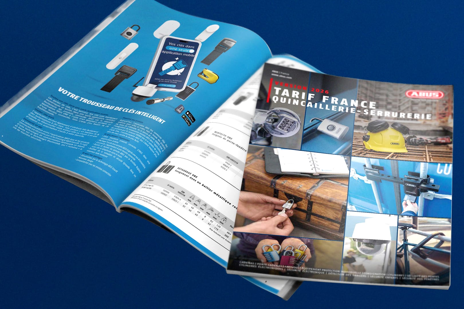 Depuis 1924, l’entreprise allemande ABUS (August Bremicker Und Söhne) fabrique des produits de sécurité (cadenas, câbles, chaînes, sécurité au travail, cylindres de porte, sécurité de portes ou de fenêtres, électronique, protection anti-incendie, contrôle d’accès, vidéo-alarme…). J’ai réalisé pour elle plusieurs catalogues (tarifs quincaillerie, 312 pages ; tarifs cylindres, 84 pages), des brochures d’outils de vente ou de formations, 4 à 12 pages), des 3 volets ainsi que des packs produits, blisters, annonces presse, dossiers de presse et PLV.