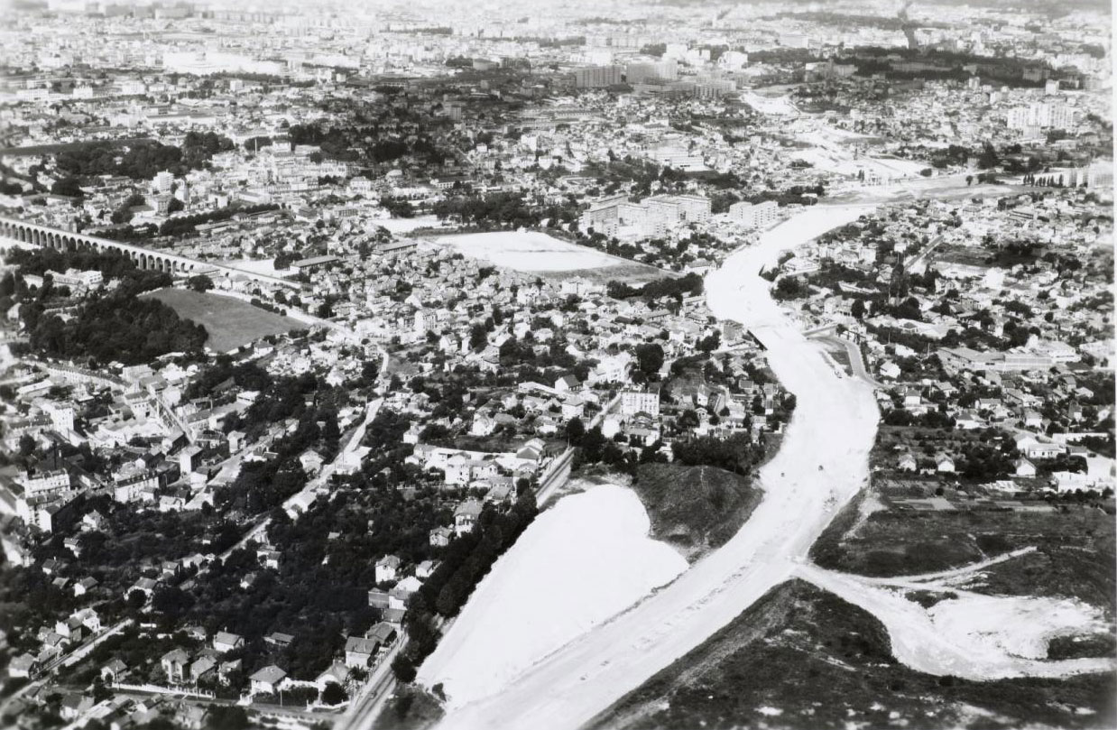 La coupure dans le tissu urbain varie de 35 à 60 mètres pour deux chaussées à quatre voies, occupant chacune quatorze mètres de largeur. Les travaux de l’autoroute du sud seront lancés en 1957 comme le montre la vue aérienne ci-contre d’Arcueil au boulevard périphérique (à la porte de Gentilly).
