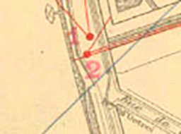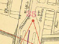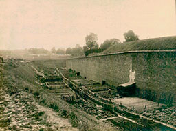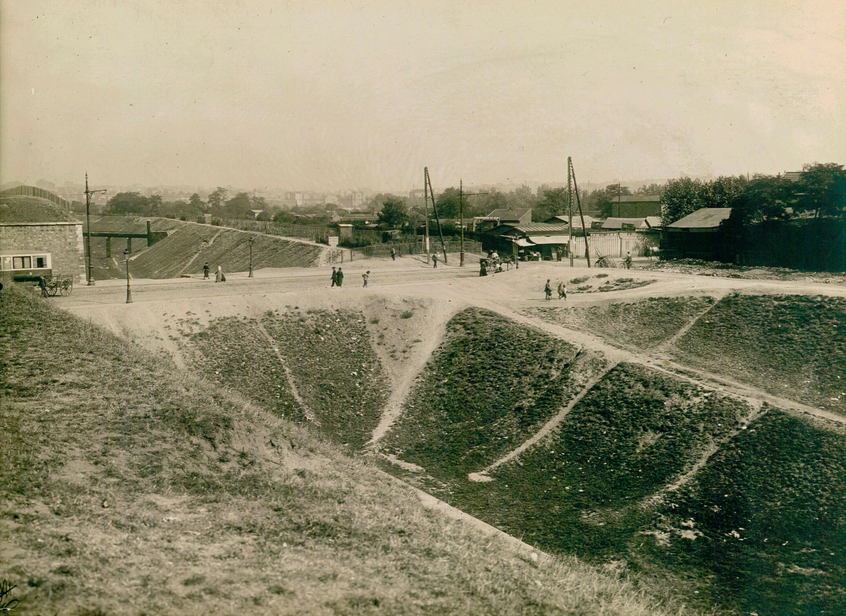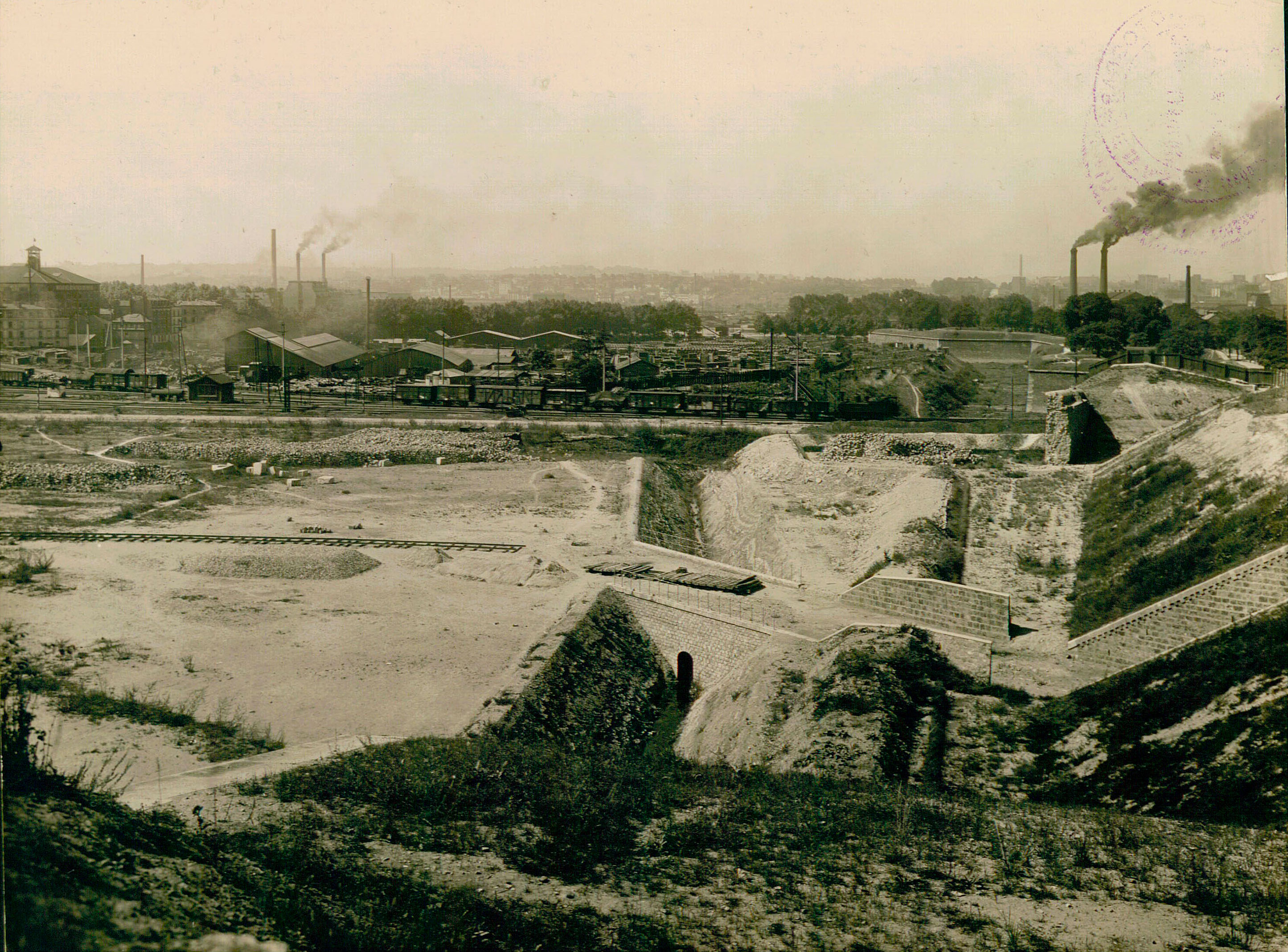 09-Bercy, vue de l’enceinte et des terrains à l’intérieur de Paris (XIIe) depuis le bastion n° 3 jusqu’au bastion n°1, la dernière partie de l’enceinte, en haut, existe toujours, vers banlieue